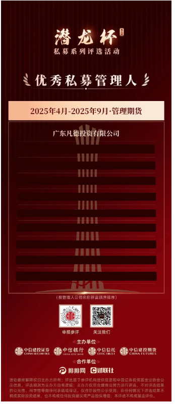 近日,中信建投证券第五届“潜龙杯”私募大赛第三阶段评选榜单公布,评选期间,我司参赛产品凡德量化八号表现突出,经过激烈角逐,我司被中信建投证券第五届“潜龙杯”私募大赛评为第三阶段管理期货组优秀私募管理人!