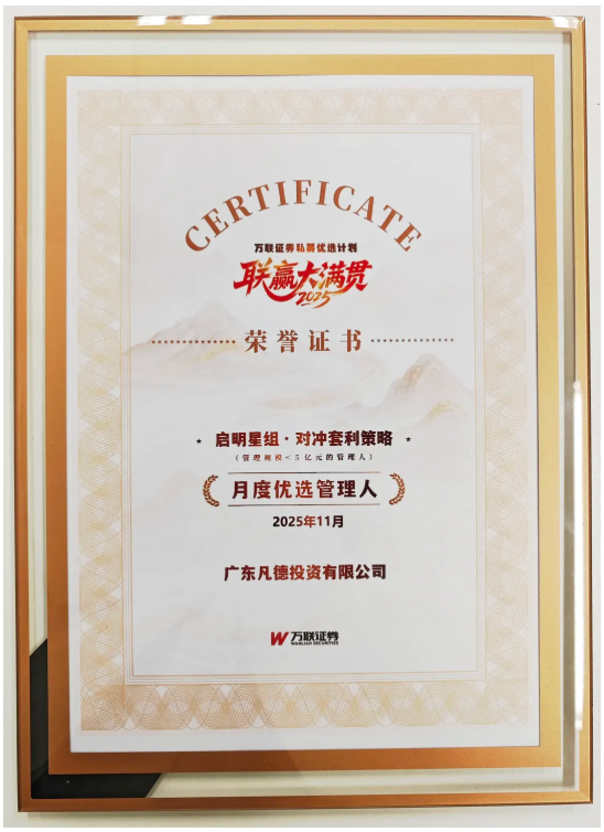 近日,万联证券“联赢大满贯”私募大赛11月榜单公布,评选期间,我司参赛产品凡德量化八号表现突出,经过激烈角逐,我司荣获启明星组对冲套利策略月度优选管理人!