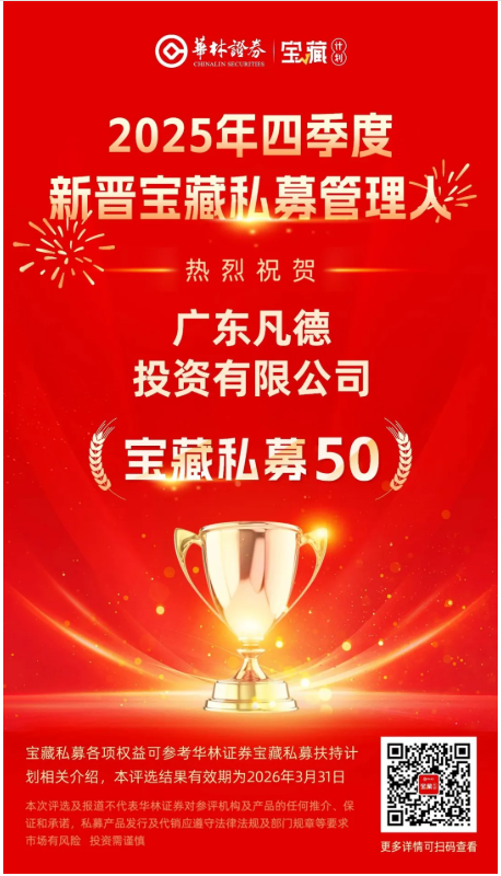 近日,华林证券公布“华林宝藏计划”榜单,评选期间,我司表现突出,被评为2025年四季度宝藏私募50新晋宝藏私募管理人!