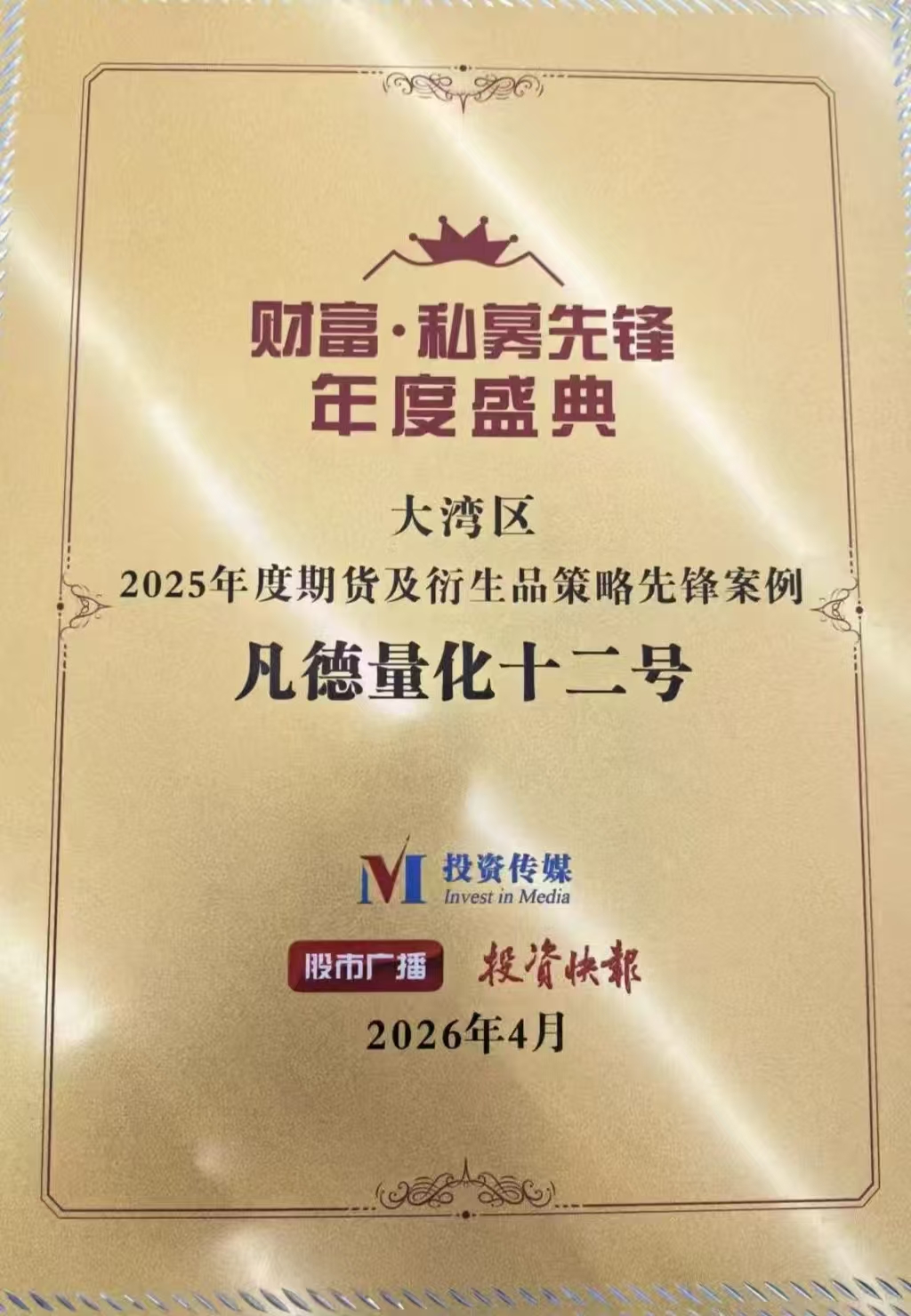经过两个月的集中申报与“定量+定性”打分,在公开、公平、公正的原则下,2025年度先锋案例结果已全部出炉。我司凡德量化十二号被评为2025年度期货及衍生品策略先锋案例。